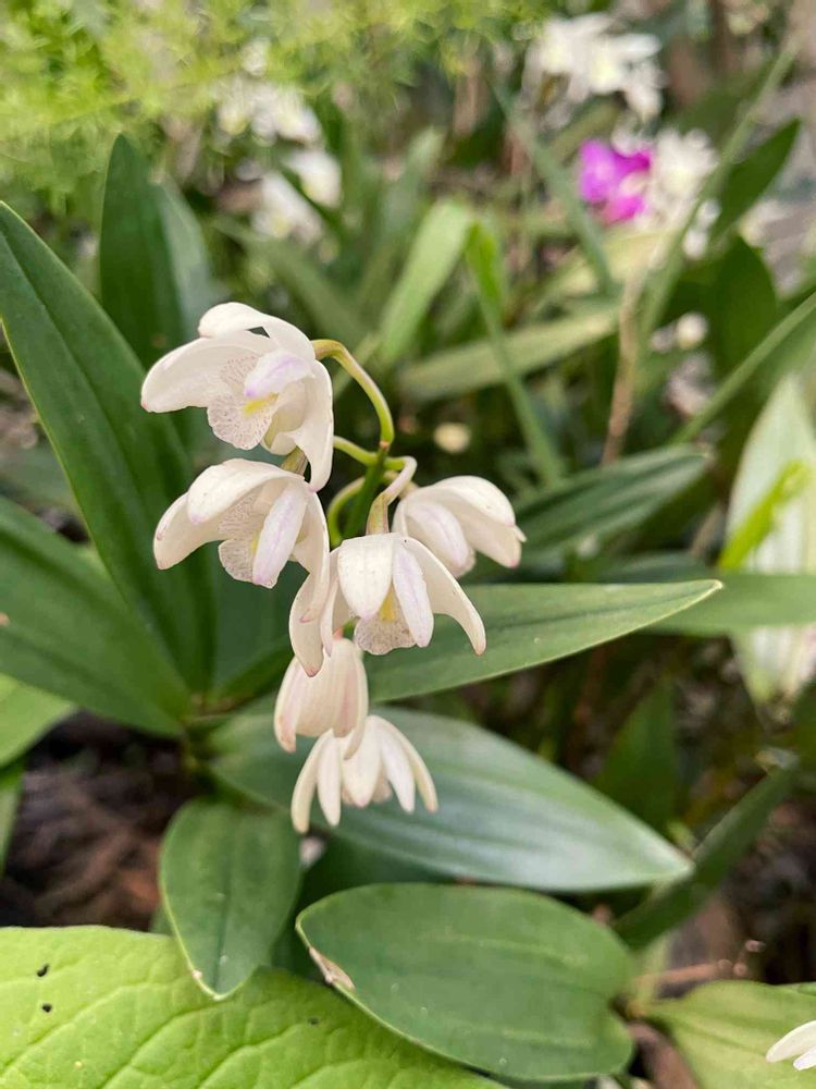 裏庭の隅で、デンドロニウム キンギアナム🤍が、ひっそりと咲いています。奥に紅いのも見えます。💖