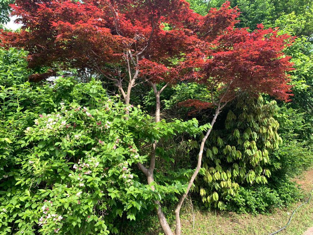 道端に紅葉、葉の面白い木、そして綺麗な花が咲いている木。