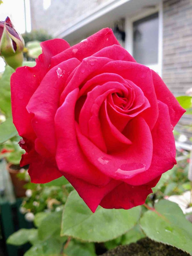 初開花のスムースベルベット🌹棘の無い薔薇だそうです😌残念な事に我が家からは後姿😭お隣の駐車場を向いておられます🤩駐車場からの撮影🤳✨それにしても存在感凄いわぁ👏👏