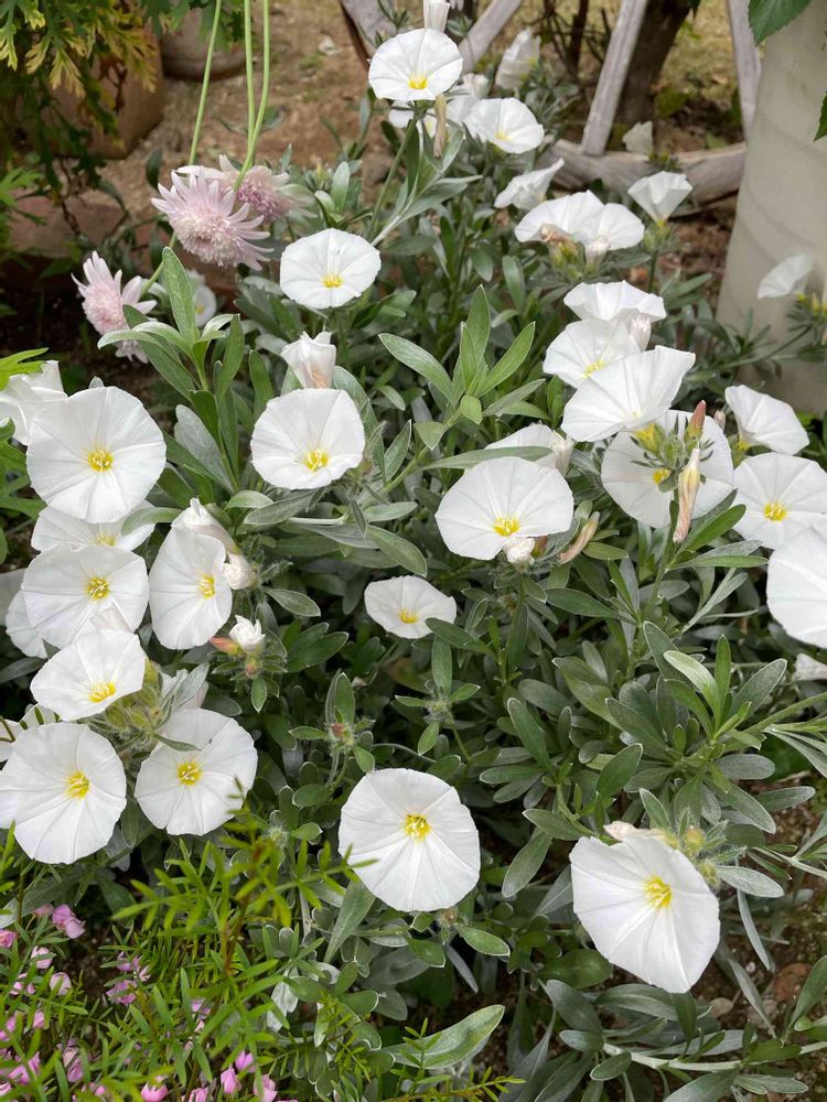 シルバーリーフと真っ白なお花のコンボルブルスです😊