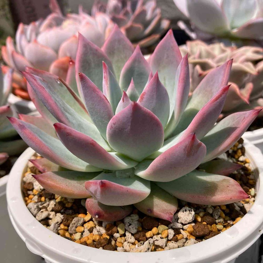 コロラータ丼にしていましたが、みんな大きくなって狭くなったのでこの子は独り立ちさせました♪4.5号鉢なので大きい子コーナーに。ピンクとグリーンの色合いがとても好きです♡