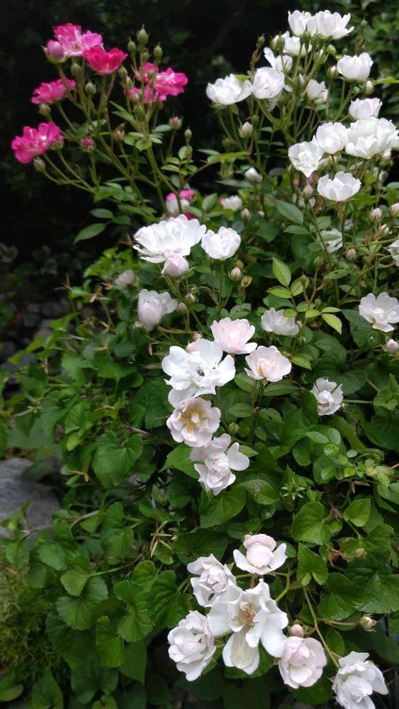 小さな庭,レンゲローズ(ピンクと白),スミレ(白)の投稿画像