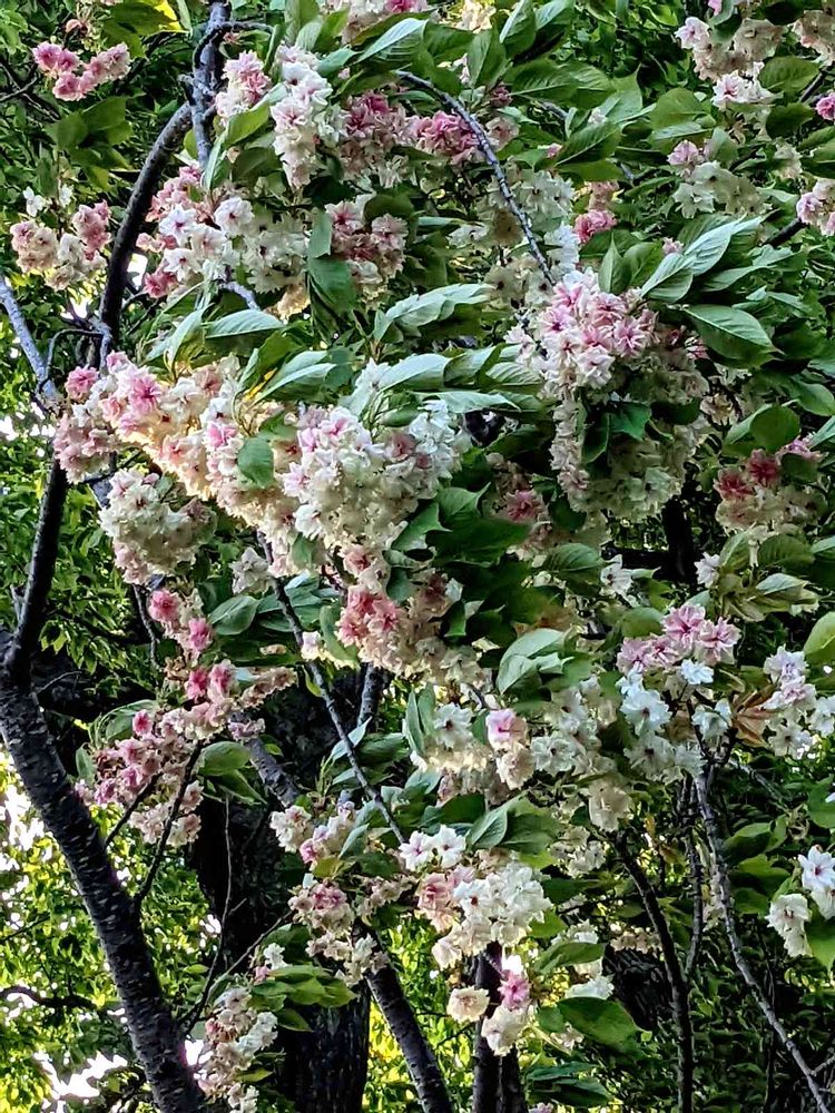 須磨浦普賢象でしょうか。桜の品種の一つのようですが、あまり、聴き慣れない名前。近所のシャトーに、咲いてました。4月末の写真です。桜なのに、花が、ピンクと白、そして、みどり色も、まじって、不思議な色合いでした。友人が見つけてくれました。