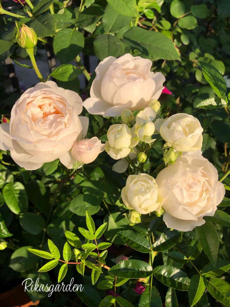 グラミスキャッスルとシュネープリンセスの鉢がくっついていたので、重なりあって咲いちゃっていました。