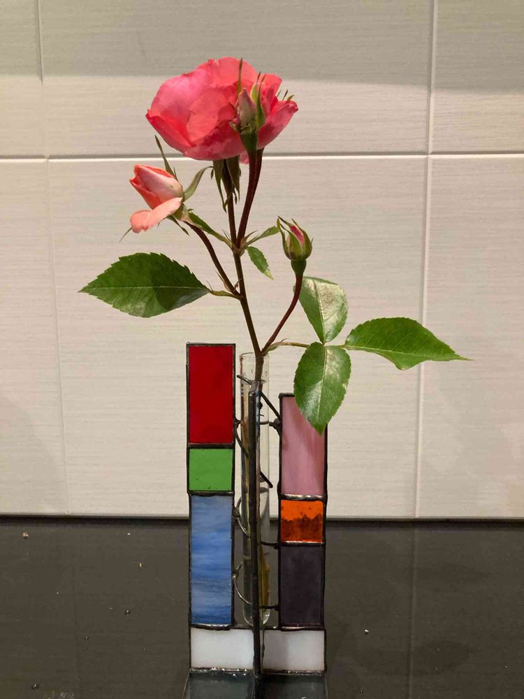 ステンドグラスの一輪挿し、立体にするのが難しかったけど、そこは先生がうまくやってくださって、、、(≧∀≦)