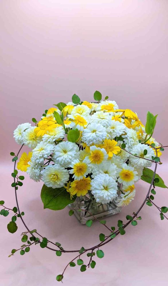 マーガレット、春菊の黄色のバランスがイイ感じに生けられました💛🤍💛🤍💛🤍💛✨