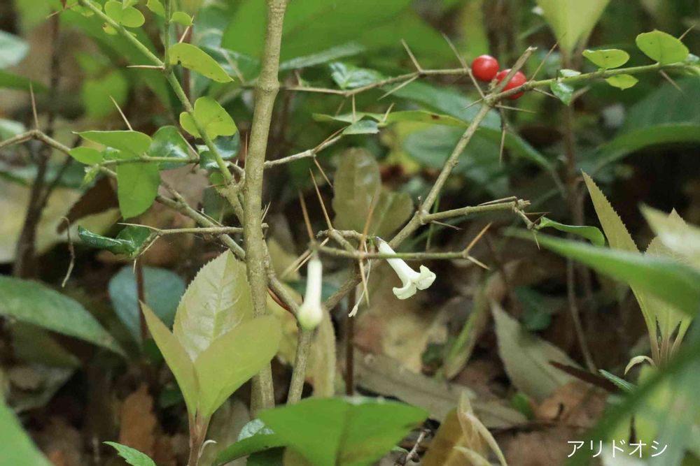 細長いトゲがあり筒状の白い花(1cm)が咲き、冬に赤い実が成ります