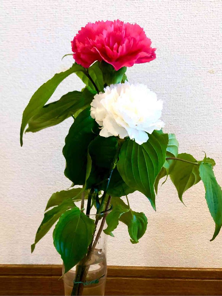 花屋さんで買った赤と白のカーネーションに、ウチの庭のヤマボウシの緑の葉を添えました。🔴⚪️🟢