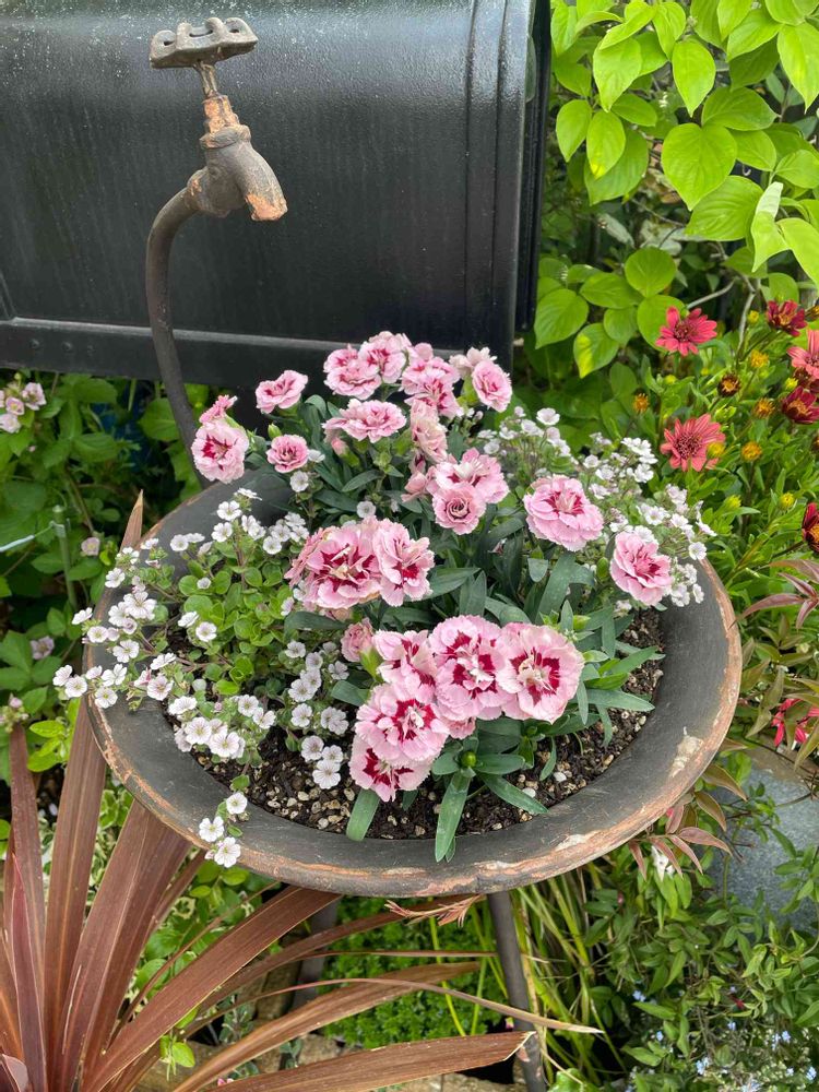 ダイアンサスも優しい色で、カーペットかすみ草も可愛い〜