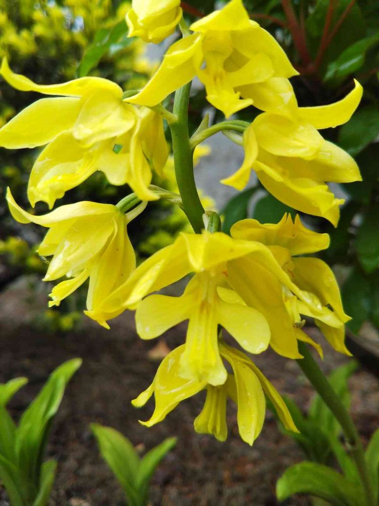 おはようございます⛅️昨晩の雨でお顔を洗顔した「エビネ」蘭満開🌼🌼🌼🌼🌼汚れ綺麗に落ちました。近所のご婦人から頂き五年以上、茶色もあったが⁉️今のところこれだけ咲きました😂