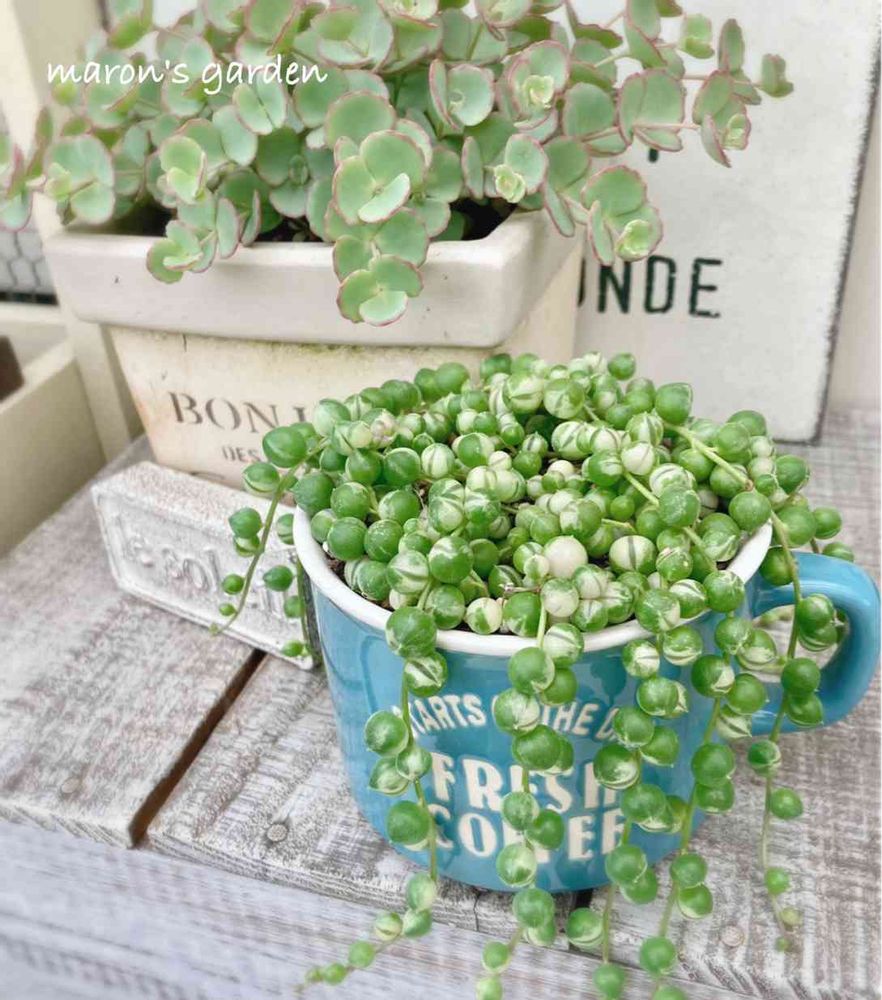 青いカップから溢れだす斑入りグリネさんが可愛いですね❤️きゅ(,,• × •,,)~ん❤️