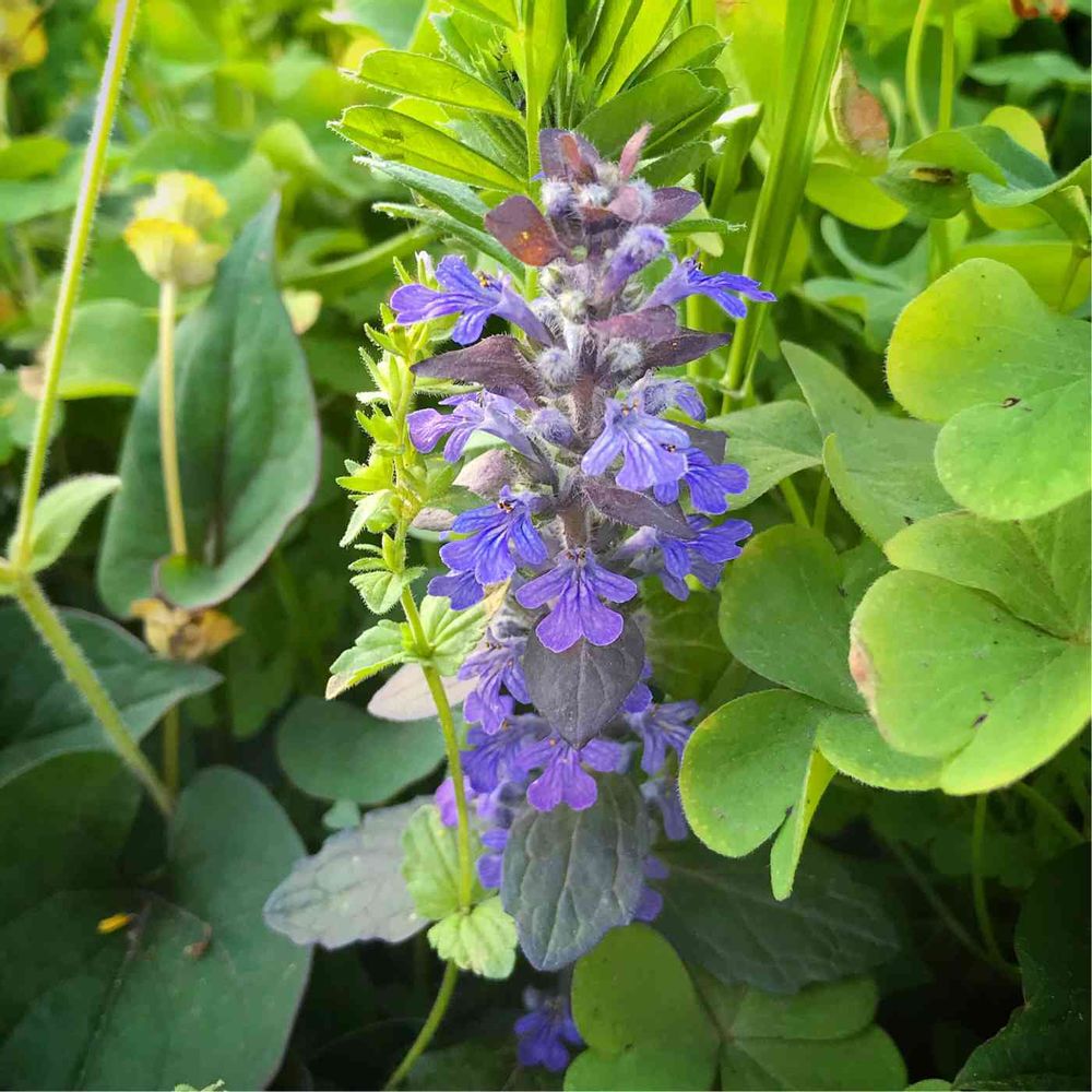 雑草に隠れるように、ジュウニヒトエ(アジュガ?)。