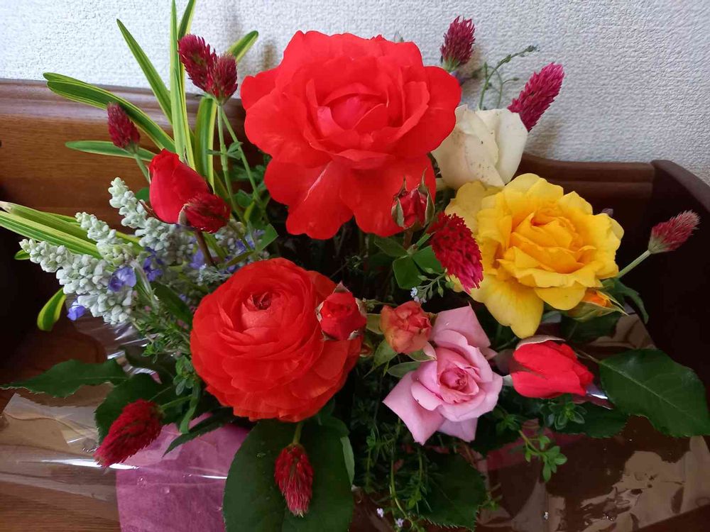 母の日は、庭のバラたちでアレンジして義母に届けました。