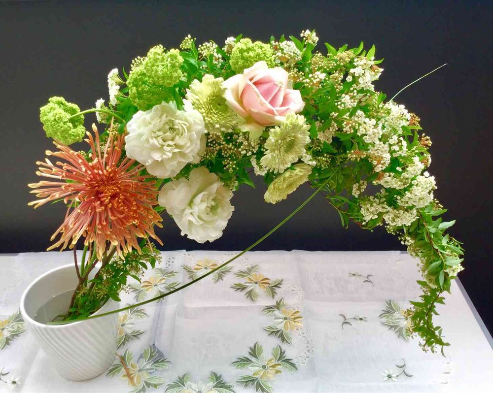 三日月型でアレンジしてありますがレッスンでは、左右に水盤を置いてコデマリは剣山を使い、薔薇などはコデマリの中にさして支えるアーチの様に仕立てる形でした💦自宅には飾るスペースが無いのでこんな形に😅自己流なのですみません😅