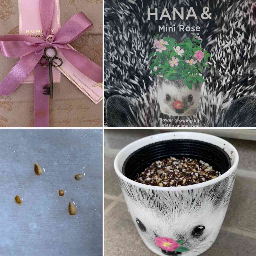 ハリネズミのポットで育てるミニバラの栽培セット、だそうです。ネットで検索しても上手くいった情報が無いので不安ですが😅老眼で苦労しながらも種まきしました👍