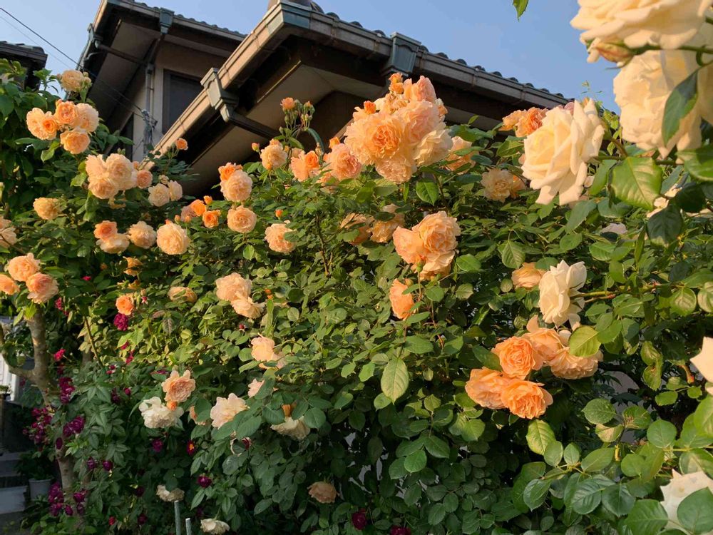 さん、はい、つるバラです。アプリコット色にオレンジがかった色で花が房になって咲くので豪華に見えますよ🌹横張りなので両側に枝を広げると4〜5mになりますがある程度のスペースがあれば枝の長さは調節できますから大丈夫と思います🌿