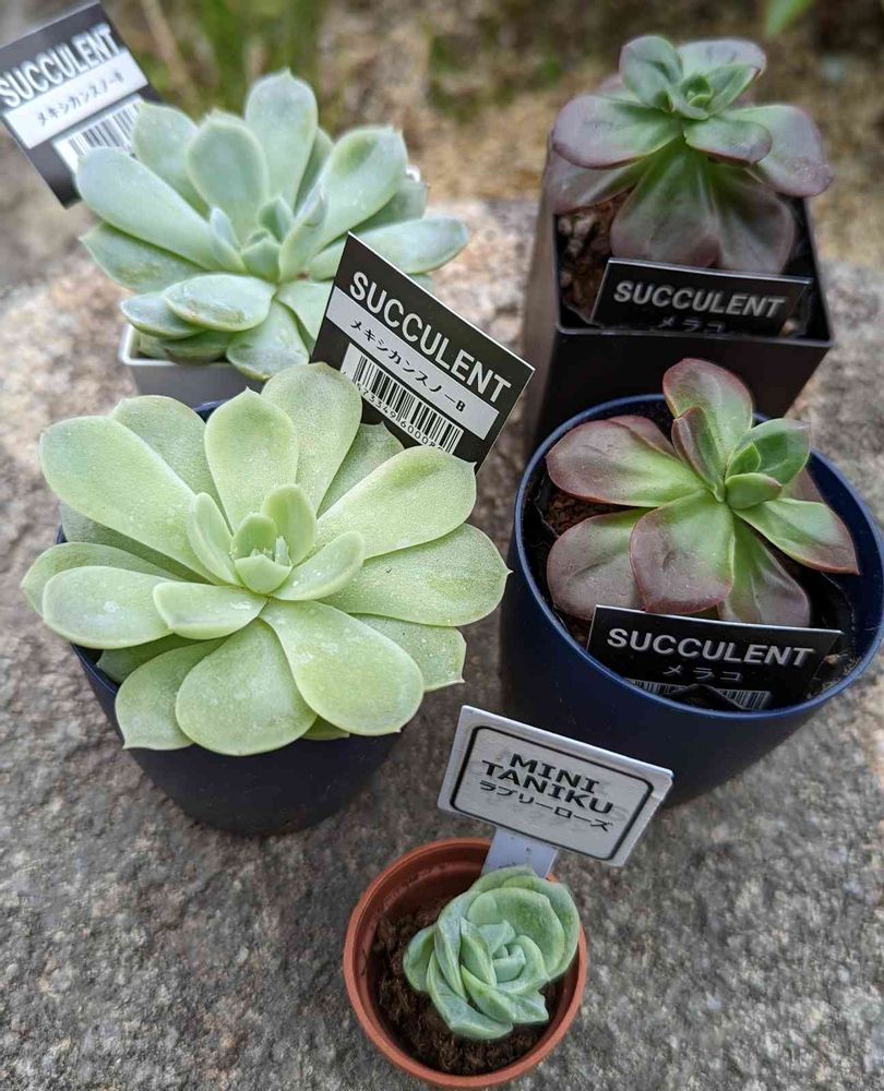 左2つがメキシカンスノーボール。右2つがメラコ。手前のミニがラブリーローズ。