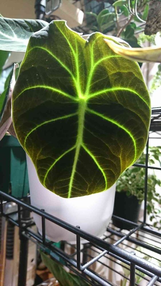 逆光だと黒いベルベットな葉にある白い葉脈が、夜光塗料のように緑に光ります。なんて妖艶な美しさ✨
