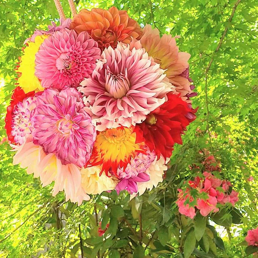 結婚式(披露宴)で着物を着た際、「髪の毛は地毛で日本髪のように結ってもらい、そこに生花のダリアを飾りたい」と希望したところ、手にはダリアで作ったブーケではなく、c_demi さん の お写真にあるような鞠(?)を持たせていただきました💐👘💐