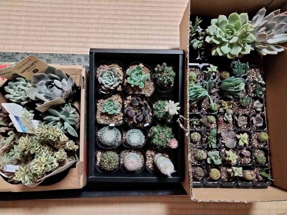 多肉爆(?)買。右の二箱は2,460円。プラグトレイが多肉バイキング♪でサボテンは100円。花が可愛くてついプレゼント用に。左の一箱は別の店で。韓国苗が2つとエケベリア、アトランティスで3,000円くらいでしょうか。
