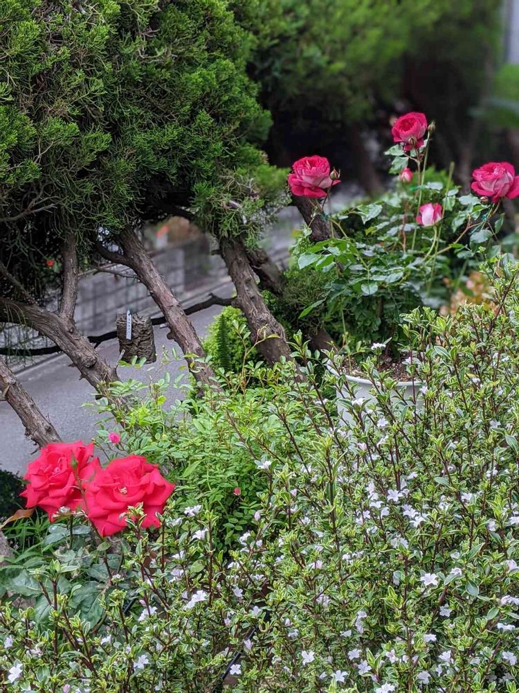真紅の薔薇+ハクチョウゲだよ〜今が花盛り👏😄💖🎉