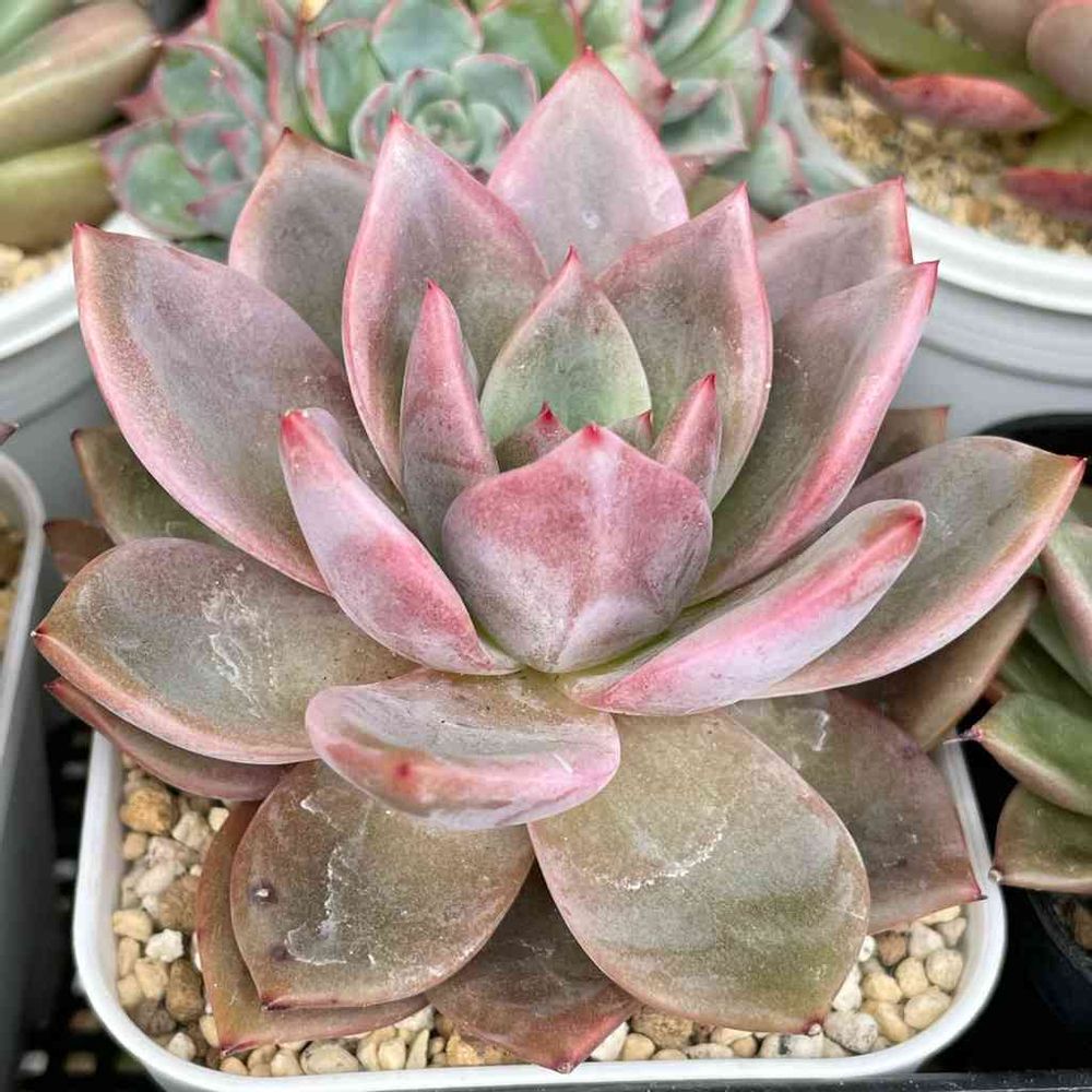 多肉も紅葉がさめはじめ、緑色に変わってきました。白夜も微妙な色合いになっています😅葉裏はピンクで可愛い❤️