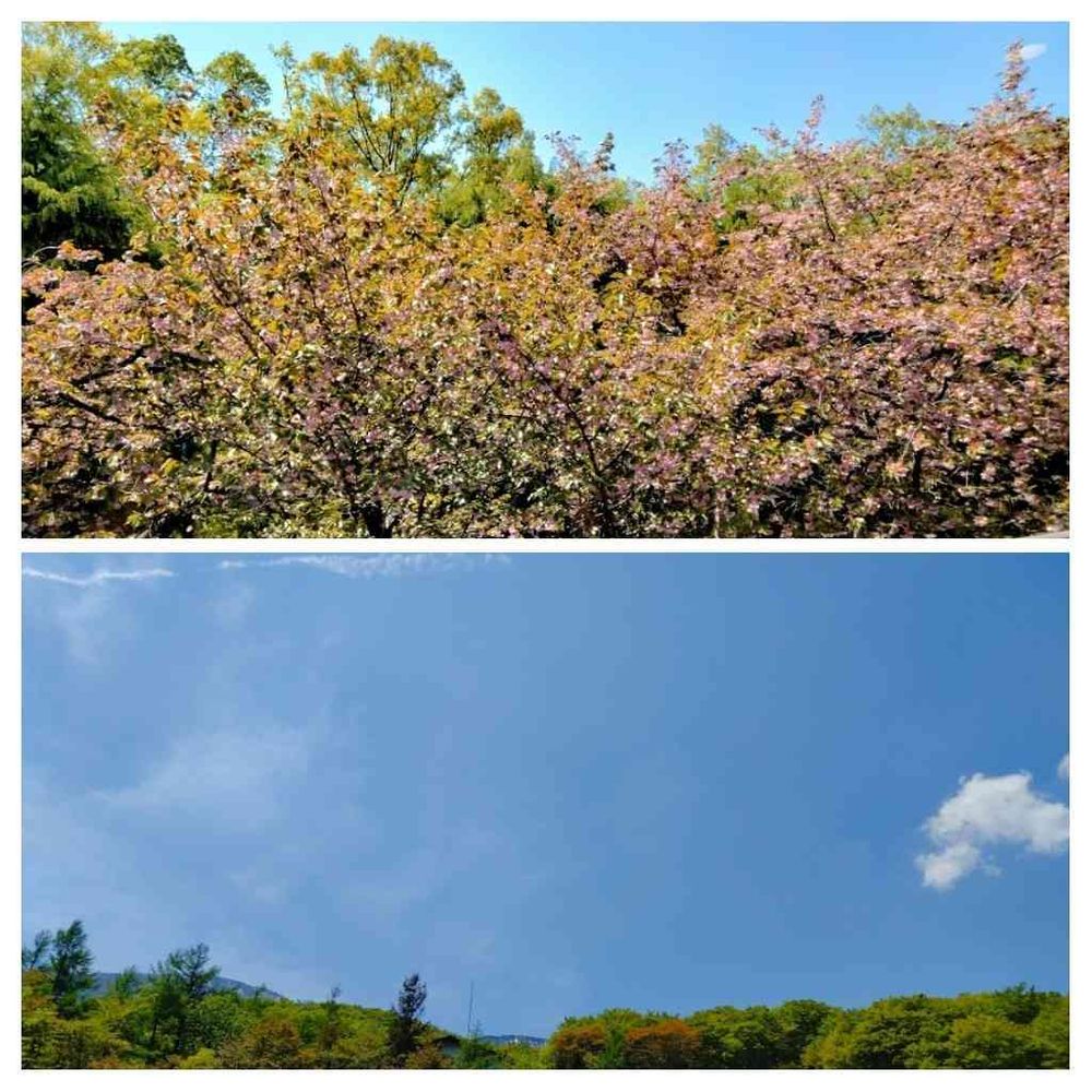 6日の空と温泉の窓越しの八重桜、週末に向けて天気は下り坂らしい
