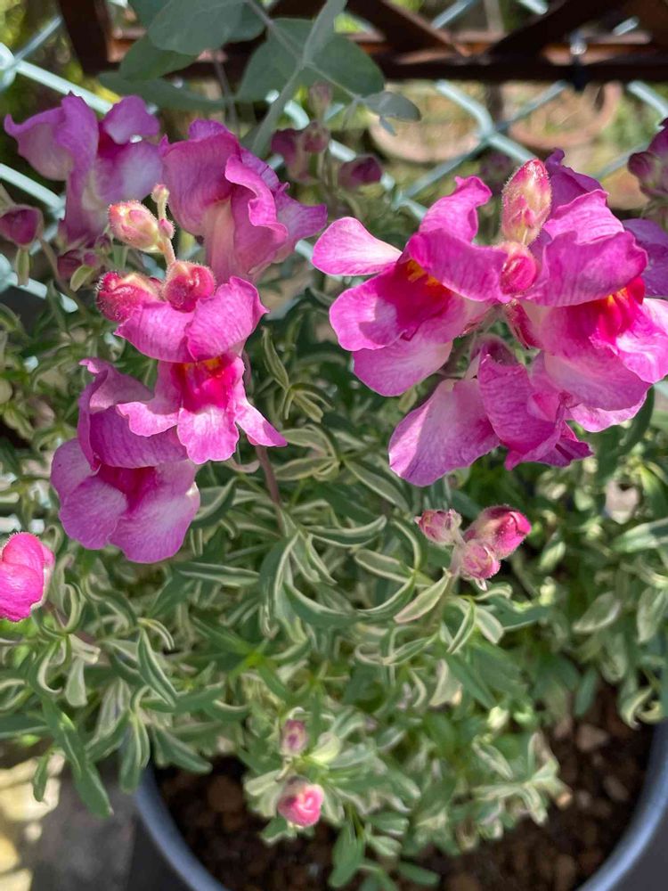 見切り品コーナーで見つけた斑入りの金魚草、派手な色の花が咲いた😅