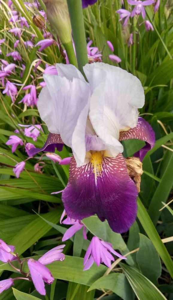 通りすがりに見かけました、紫色と白色のジャーマンアイリスに似ている花☺️