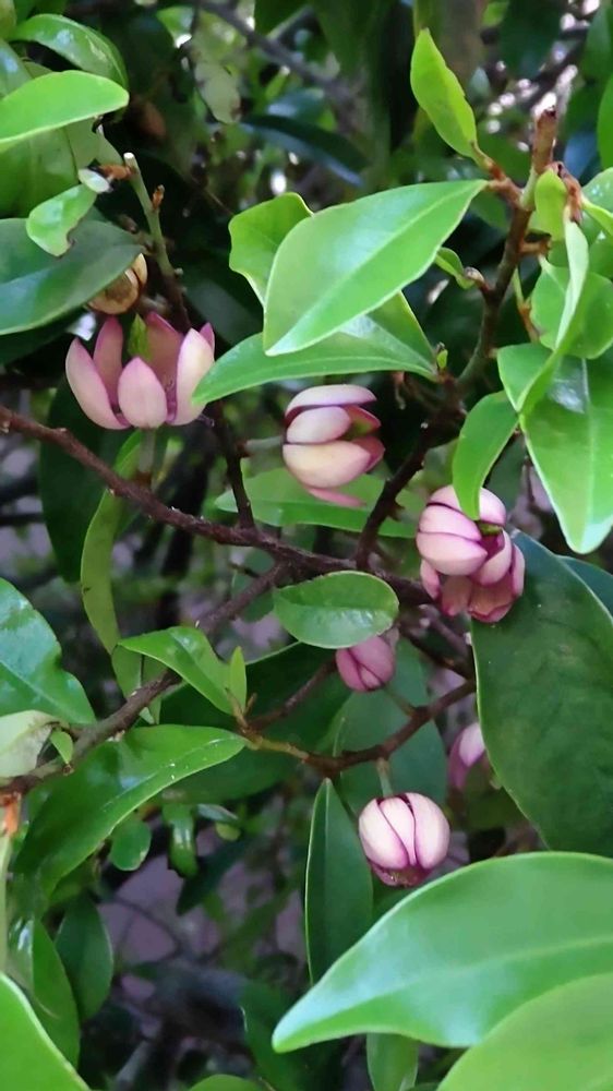 カラタネオガタマは 花びらがクリーム色で 淡赤紫色の縁取りが付いた 蕾咲きで どちらかと言うと地味な花ですが バナナのような甘い香りがあり 辺りに漂います。
