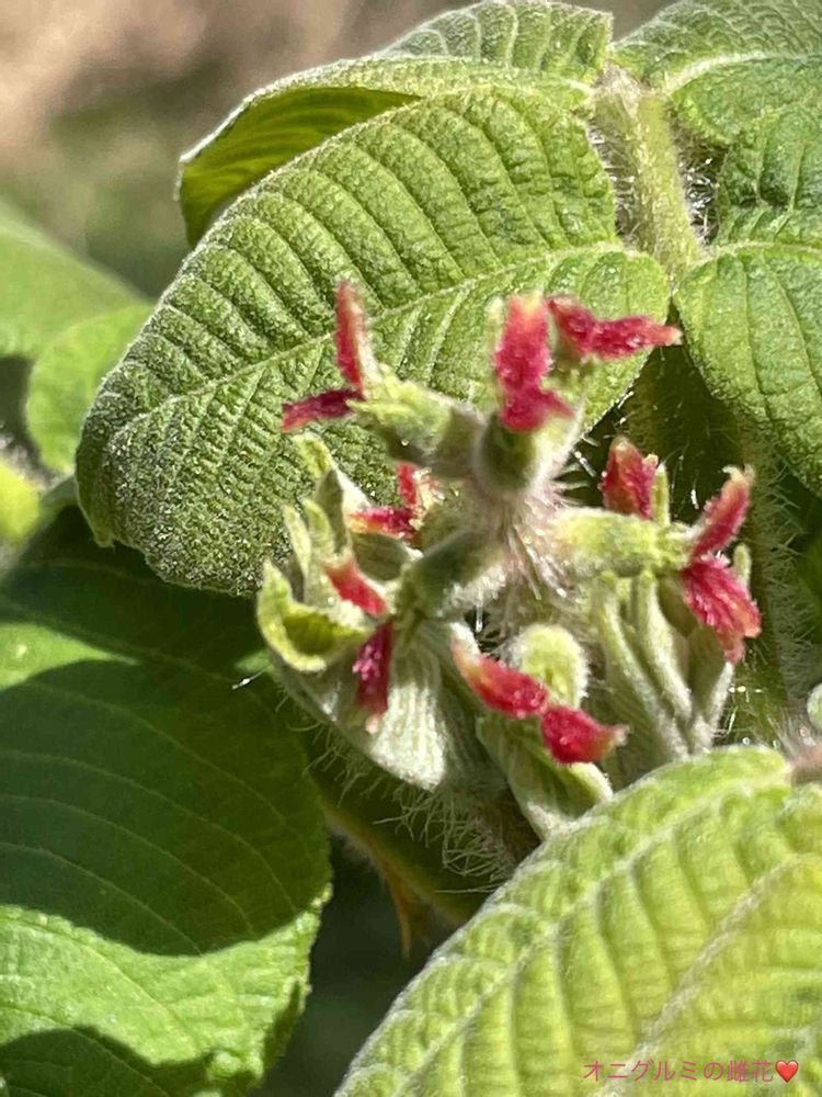 ♀雌花…新枝の先端に花穂が直立して10個ほど咲きます雌蕊は赤く二股になってます、花の根元の部分は大きく膨らみ、白い毛が沢山生えていてこの部分の中身がクルミの実になり、9〜10月に実が熟します