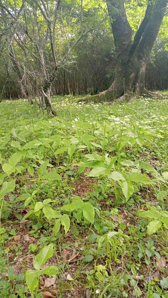元寺の境内 オオハンゲの三つ葉が広がり細い花穂を出しています。🤗