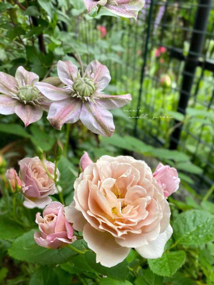 薔薇とクレマチスの花色のトーンがよく似ていて素敵なコラボですね💕