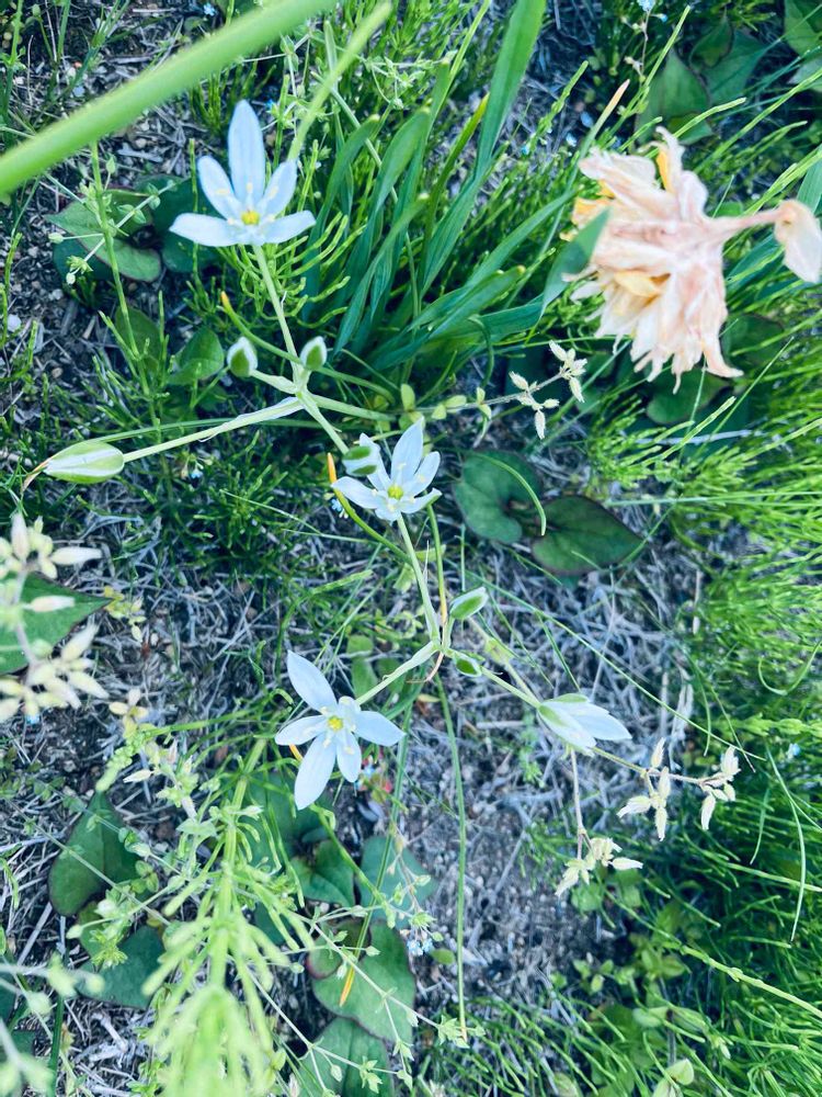 白花は、オーニソガラム・ウンベラタムまたは、ウンベラータムだと思います。真ん中をよくご覧下さい。星に見えませんか?別名ベツヘレムの星と言いますよ😊💓