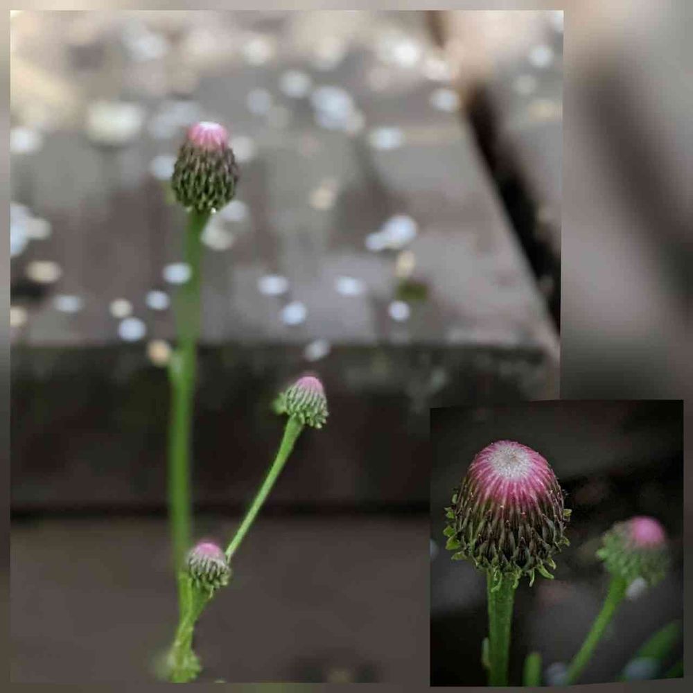 デッキのステップ下の狐薊も背が伸びました 斜面の日当たりの良い場所の狐薊はグングン成長して昨日もうピンクの優しい色で咲いてくれていましたが こちらはじっくり観察させてくれるようです