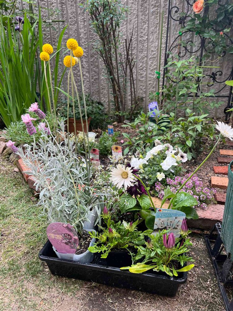 右奥から宿根ガーベラ、紫のガーベラ、真ん中奥、紫サルビア、左奥クラスペディア、左手前ラベンダープリンセスゴースト。明日夕方植え付けしたかったけど明日は雨☔️なのでまた先送り…。ナチュラルガーデンを目指しているのに、庭主がナチュラルではないので庭の草花もギラギラしてる😆