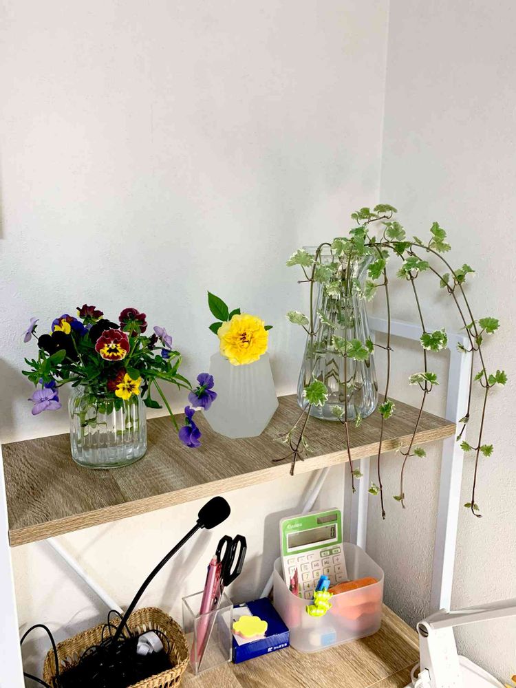 在宅環境を改めて整えまして。花用の棚を確保👍朝、手入れでカットした庭のお花を飾れるようになりました😌