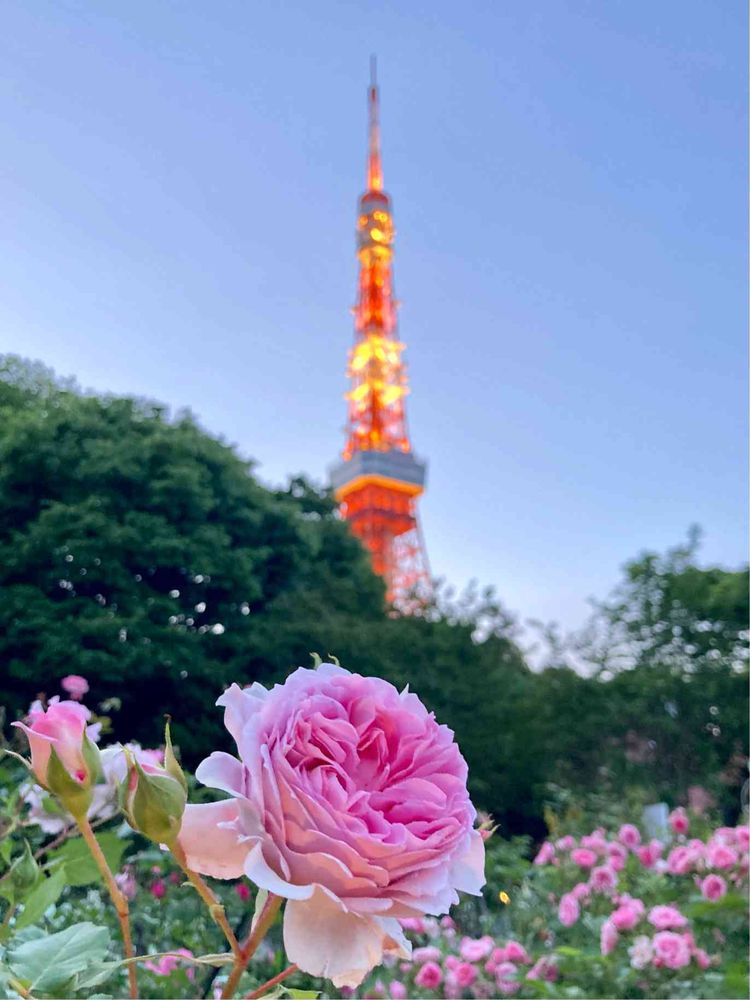 あちらこちらで薔薇が咲いていて楽しめますね☺️東京タワー🗼と薔薇🌹のコラボが素敵❣️です!