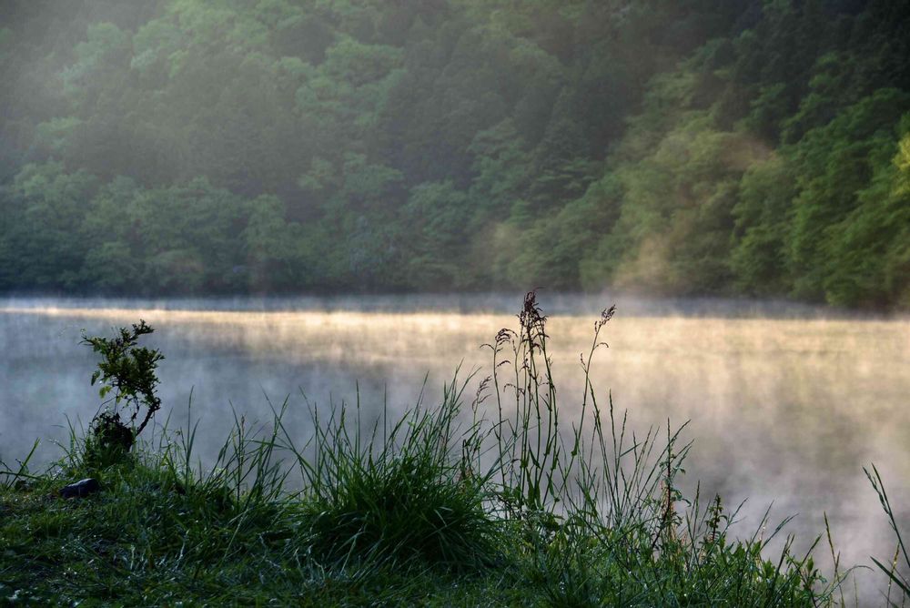 打って変わって、早朝から快晴、湖から盛大に川霧があがってます。一応形だけでも「スイバ」越しの湖面です😆
