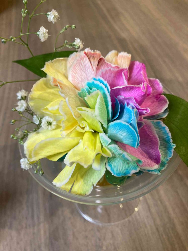 カラフルなジェルボールに、虹色カーネーションとかすみ草が入った、パフェみたいな可愛らしいお花のプレゼントをもらいました(*´꒳`*)