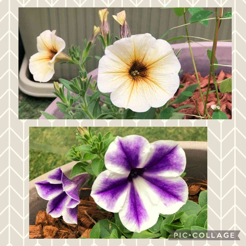 サカタのペチュニア、ビューティカルのフレンチバニラとサントリーフラワーズサフィニアアートるりいろ風ぐるま、植木鉢に植え付けしました💛💜