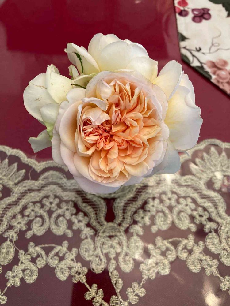 ジュールベルヌの一番花が開花しました。爽やかな香りのする小振りの可愛いバラです。