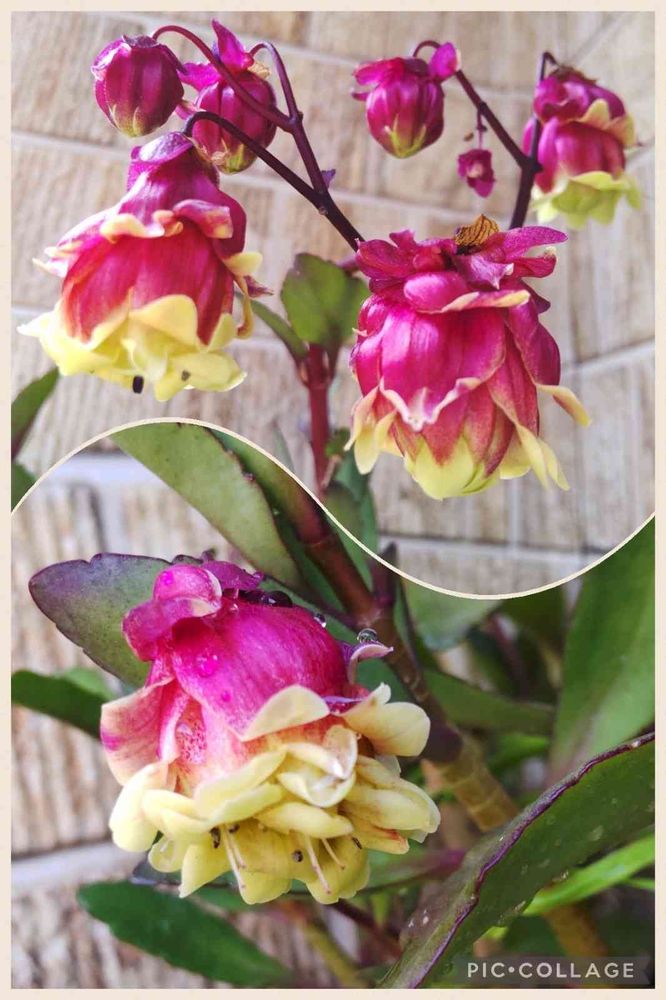 📝ドイツで育成されたカランコエ、ウエンディの八重咲き種。下向きに垂れ下がる姿は蕾の頃から可愛らしく、パカッと開いた姿はフリルのスカートのよう(💻🔍より)