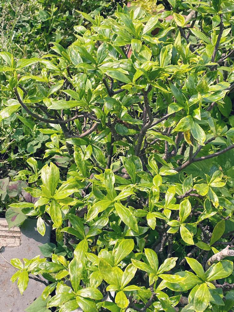 令和4年5月11日(水)晴れ☀️ おはよー^_^ございます 小さい庭で朝の見廻りしています。picは今の小さい庭の老木🪴沈丁花です、今の時季は葉が青々としています。