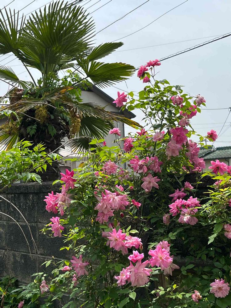 😮オ😄ハ😚ヨ😘ウ ございます🌸 ゴールデンウィーク中、帰省した時にパチリ📸 実家の ピンクのつるバラと、シュロの木です❣️ シュロの木は、樹齢 60 年以上だと母の話です•*¨*•.¸¸☆*・゚バラを見守るようにやさしく元気です(*ˊᗜˋ*)/