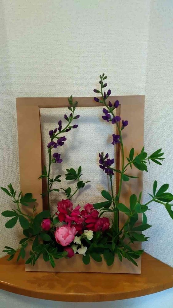 器はアレンジメント教室で作った紙袋の額縁風の器。今回も和風テイストかな。紫💜の花の名前がわかりません。知っている方がみえたら教えてくださいませ🙏🙇