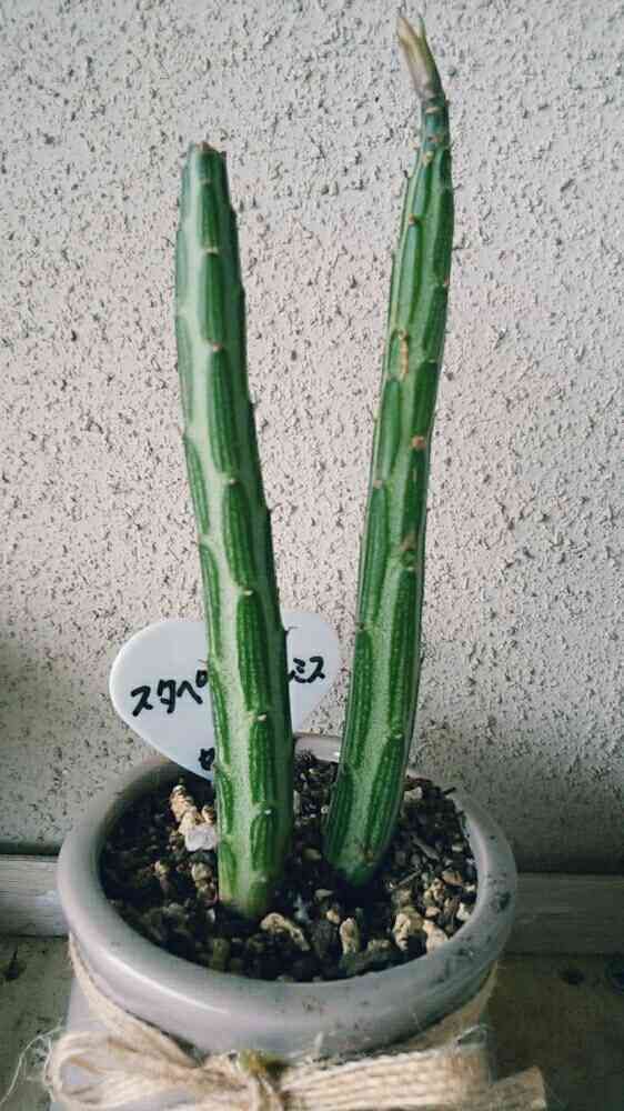 こんにちは。土からチンアナゴが顔を出しているような姿のスタペリフォルミスかなと思われる多肉さん。先っぽに新芽らしきものがついていたのでパシャ!です。( ´∀`)今日は雨が十時頃から降りだし少し肌寒く、燕達も姿を見せません。(*_*)