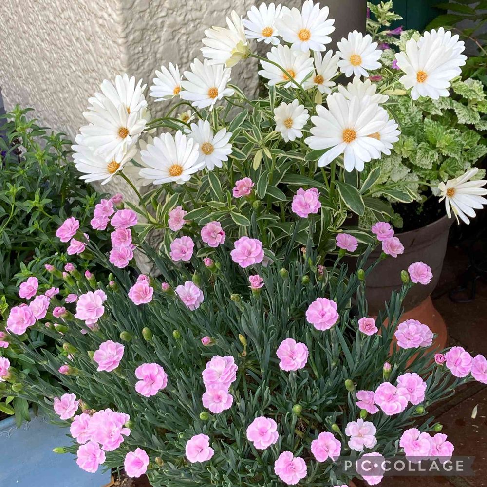 冬越ししたサントリーさんのミーテ さくらピンクと斑入り葉のオステオスペルマム ホワイトバリエガータです💕✨🤍