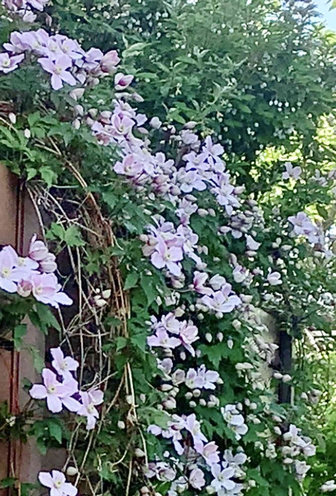 お隣り側のフェンスにまで溢れてしまったモンタナです。株元から5メートルはツルが伸びてしまい大変な事になってますがまぁ迷惑にはなりそうもないのでもう少し伸ばして見ます。一体どこまで伸びるんでしょう‥