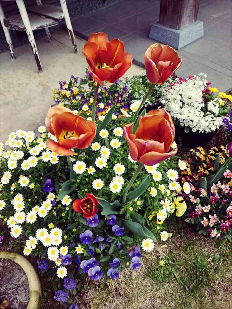 チューリップ🌷とノースポールとパンジー.ビオラこんもり🌻🌼🌷鉢からあふれております🐤